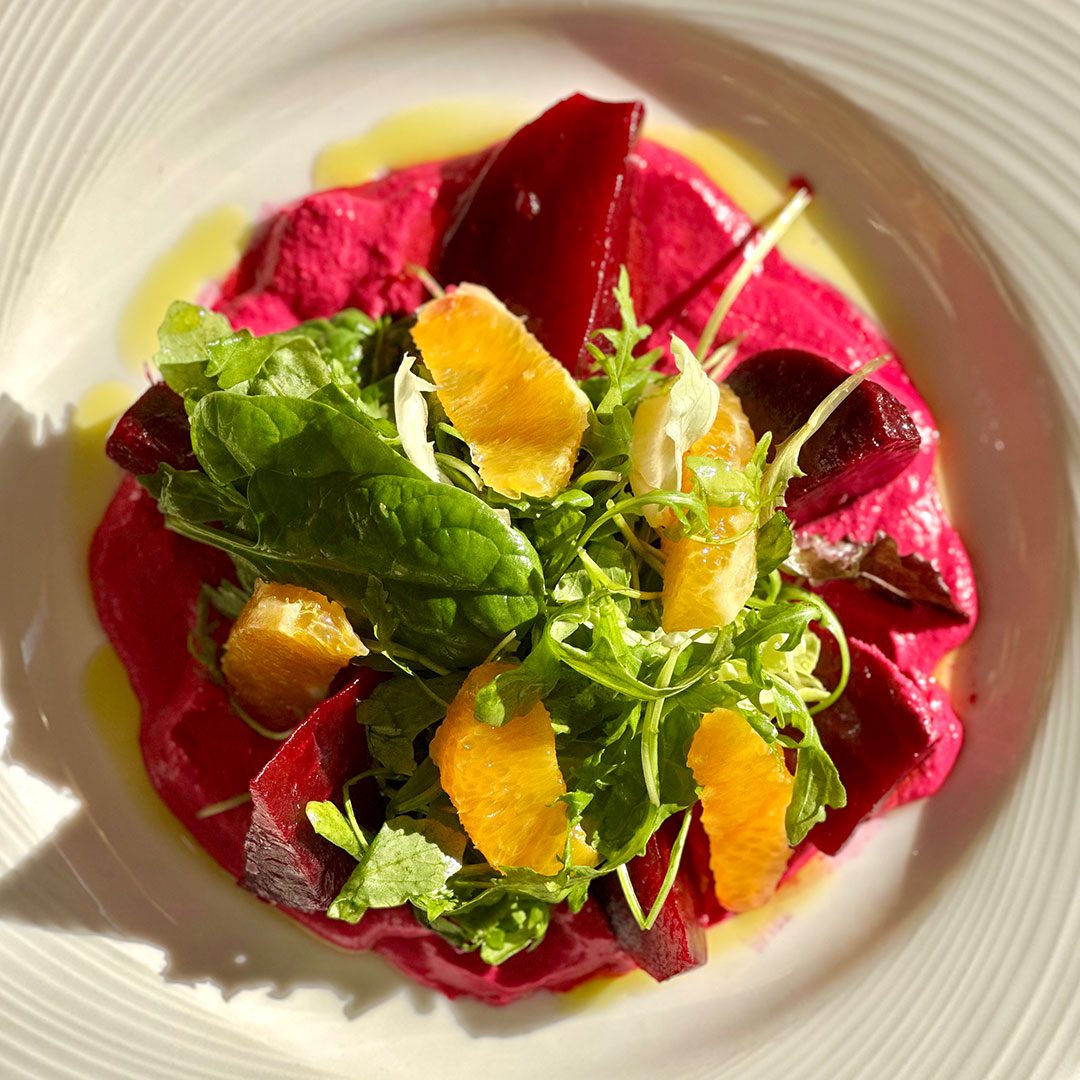 Σαλάτα πατζάρι µε φιλέτo πορτοκάλι, χτυπητή τυροσαλάτα µε ψητό πατζάρι και σκόρδο.