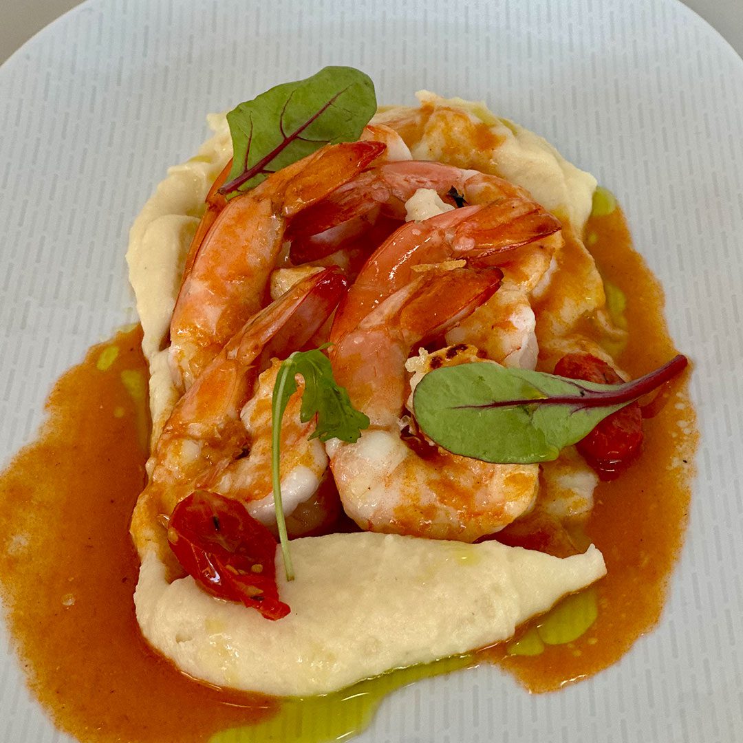 Grilled shrimp, celeriac puree, tomato confit and shrimp sauce.