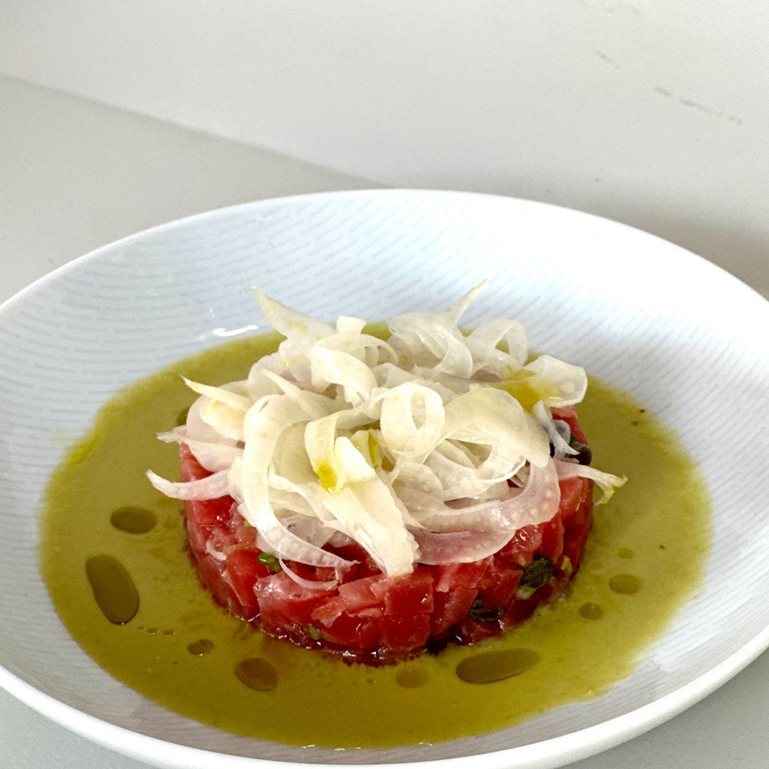 Tuna tartare with pea and green apple soup and pickled fennel.
